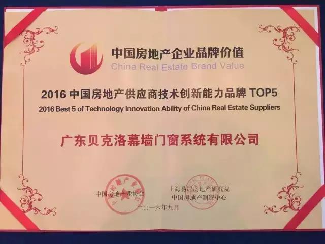 贝克洛凭借较好的技术和创新能力荣获“2016中国房地产供应商技术创新能力品牌TOP5”。